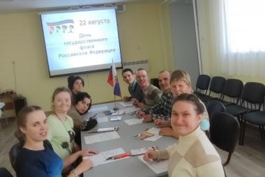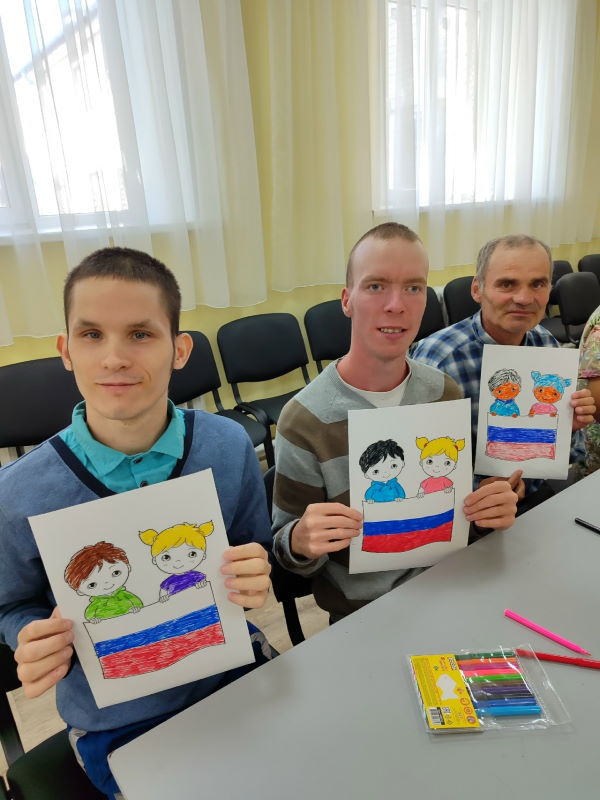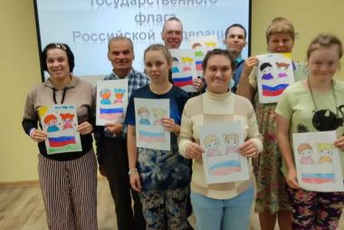 В рамках Дня государственного флага России музыкальный руководитель Анастасия Валерьевна провела познавательный час для получателей социальных услуг «Флаг моего государства». Открыли мероприятие песней Дениса Майданова «Флаг моего государства». Анастасия Валерьевна рассказала об истории государственных символов России, о значении каждого цвета флага и его значении в жизни каждого гражданина. Участники мероприятия ответили на вопросы интеллектуальной игры «Флаг России», выполнили рисунки в честь праздника Российского флага.