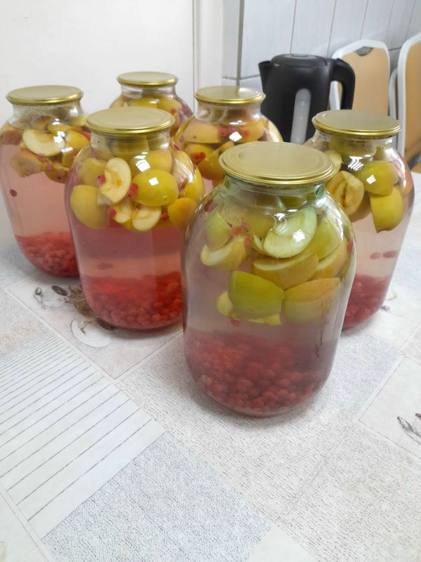 Ребята не только ухаживают и собирают, но и стараются сделать заготовки на зиму - компот из красной смородины и яблок удался на славу!